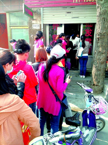 八一西街一家服装店门口,排满了集满“赞”等待领奖的消费者。 见习记者 袁文卿 耿凯丽 摄