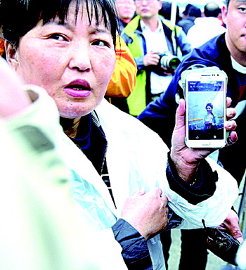 中国失踪乘客韩金姬的姐姐展示妹妹的照片。