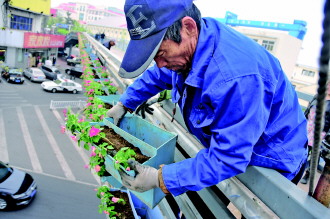 17日,在实验中学过街天桥,园林工作人员将盛开的花朵装扮在天桥走廊两侧,远远看去天桥宛若一座花桥。