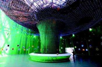 顺着长廊进入主展厅,一棵八九米高的“精灵之树”矗立在眼前,众多晶莹剔透的LED灯珠组成的树干、伞盖状树冠,在各种绚丽灯光的变化中,显得光彩夺目。“这棵‘精灵之树’是由12万颗LED灯珠组成的,这在众多展会中还是第一次尝试。”承接园艺文化中心数字视觉工程的青岛水晶石数字科技有限公司大客户经理赵永灵说。