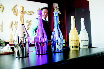 在海市葡萄酒庄的展厅里,几种不同颜色瓶子的起泡酒外观精致,瓶子的颜色十分漂亮,这也是仲崇沪从一家咖啡店里找到的灵感。当时,这家咖啡店的杯子有宝蓝色、粉色、银色和土豪金四种颜色,在咖啡厅暖色灯光的映衬下,这些咖啡杯流光溢彩,非常时尚。仲崇沪一下被打动了,他选了其中三款作为起泡酒瓶的颜色。