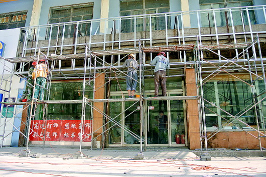 在和平路西段南侧,施工人员正在给一家门头免费安装广告牌。 见习记者 王红星 摄