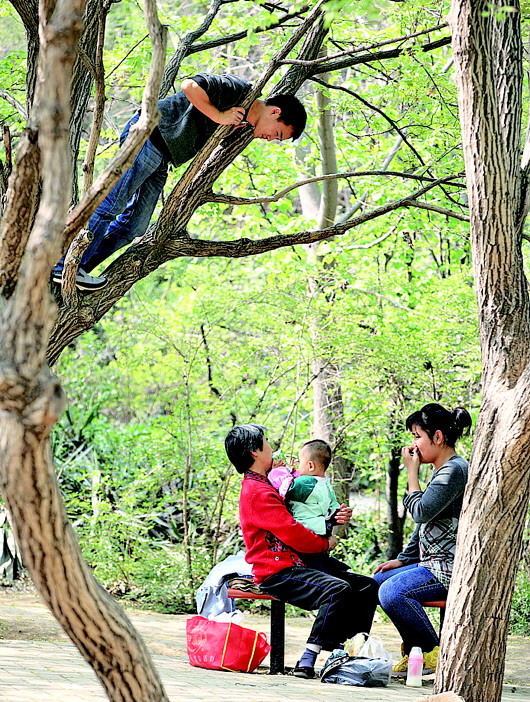 自述:为了逗孩子,爬到树上边叫孩子边做鬼脸。