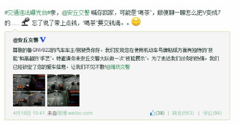 潍坊市公安局交警支队官方微博@潍坊交警于当天就转发了该微博,并卖萌跟评说:“亲,@安丘交警喊你回家,可能是喝茶,顺便聊聊怎么把V变成7的。”不久,山东省公安厅交警总队官方微博也对转发该微博,跟评说:“忘了说了,带上点钱,喝茶是交钱滴”。