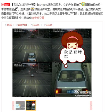 眼尖的网友很快就发现了两辆车套牌的情况。很快,网上的评论多了起来。“挂有这个号牌的车辆有不少违法记录,在网友间形成关注后,我们马上将两辆车的图片放到了一起,并置顶。”微博值班民警告诉记者,因为两辆车的违法行为发生地都在安丘,他们也随即通知了安丘交警大队,并在微博上@安丘交警。