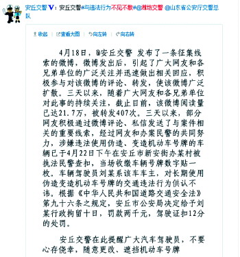 记者了解到,今年4月18日,安丘交警就曾发布微博向违法篡改号牌的车主喊话“不见不散”,引众多网友关注。而后,潍坊公安局交警支队、山东省公安厅交警总队的官方微博接连转发安丘交警微博信息,不久后,该车车主被警方找到,并进行了处罚。