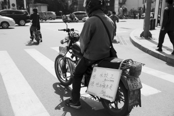 6日,在三八路上,一市民将招聘信息挂在摩托车车身上,成了流动招聘栏,吸引了市民的眼球。 本报记者 王小会 摄