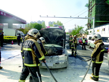 6日早8点25分,市北交警大队辽源路中队副中队长李涌正在辽阳西路百安居门前疏导交通,突然对讲机中传来民警报告称,绍兴路南向北距辽阳西路路口20米,距振华加油站10米处,一辆黑色轿车发生自燃。于是李涌立即拿起车上的灭火器跑来灭火,同时通知其他民警向过往的大客车借灭火器帮忙。