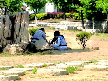 在校园内,三个同学顶着树荫打扑克。 本报记者 彭彦伟 摄