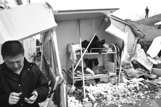 事故中受损的一间职工简易板房内,只剩一个上下铺没有被砸倒。 新华社发