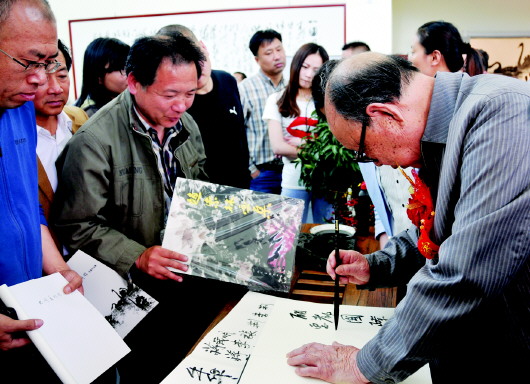 赵紫林现场为家乡父老题字留念。 本报见习记者 于雪莹 摄