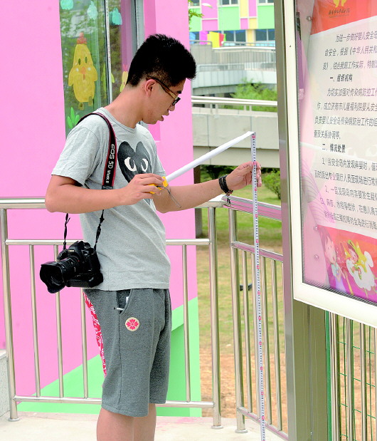 本报记者 戴伟 摄 |  | ▲4日中午,工作人员测量护栏,打算安装“弃婴违法”等警示牌。 |