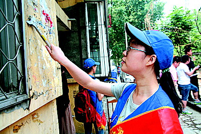 | ◤机床一厂宿舍,社区志愿者在清理小广告。 (城管局提供) |