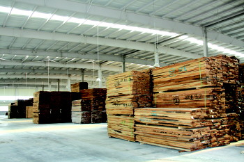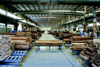 | ▲赖氏家具的仓库内堆满了从欧洲、美国等地进口的木料。 |  | ▲赖氏家具的工厂车间内整洁有序,已基本实现机械化、标准化流水线作业。 徐瑞/摄 |