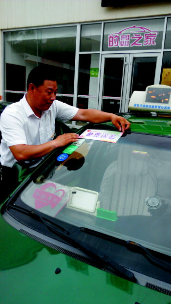 | 王永河师傅正在贴免费送考标志。 |