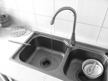 | 在牟先生5楼的新房中,因为水压太低,厨房的水龙头冒出一条细水柱。 |