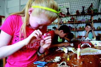 | 孩子们用广告纸、鸡蛋纸筐等废品进行再利用,编织出自己的手工作品。 本报记者 王小会 摄 |