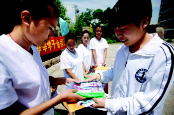 4日,在青岛一中,本报联合山东协和学院向高三考生发放“放心笔”。 本报记者 张晓鹏 摄