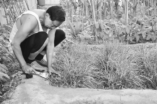 | 高先生在挖蚯蚓顺便给韭菜松土。 |
