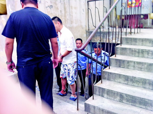 16日16时30分许,记者再次回到案发现场时,恰好碰到警方带着嫌疑人陈某指认案发现场,陈某戴着手铐脚镣,身穿白色T恤、花纹短裤,衣服和身体上有很多血迹。