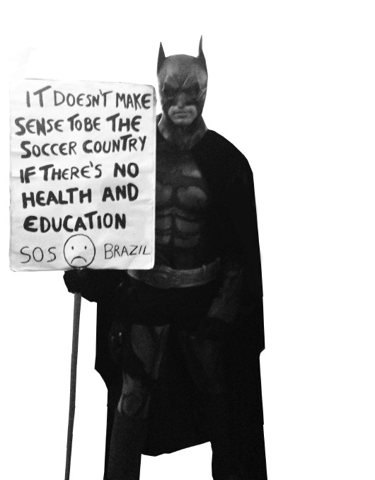 ◤一位衣着奇特的里约人举着牌子反对巴西举办世界杯,牌子上写着:没有健康和教育,成为足球王国毫无意义。