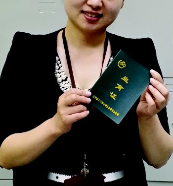 崂山区工作人员展示已经办出来的二孩生育证。