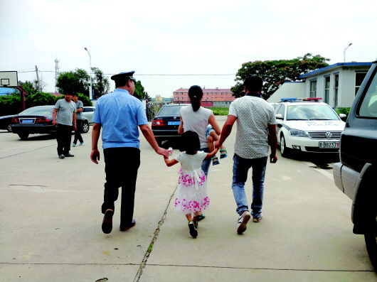 18日零时许,青岛莱西一高速服务区内,一货车主被人捅伤,货车被抢走,车上有俩儿童。5时40分,警方在平度市云山镇丈岭村农田堵住犯罪嫌疑人,因其不听劝阻,欲加害人质,民警果断开枪将其击毙。图为民警护送两名儿童和他们的父母离开。 本报记者 刘腾腾 摄