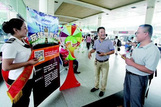 恰逢世界杯踢得如火如荼,济南长途汽车总站特别举办了“玩转世界杯”活动,邀请广大球迷旅客一同参与转盘游戏及微信竞猜,并将代表不同球队的精美礼物馈赠给旅客,感受世界杯带来的运动欢乐。 本报记者 宋磊 通讯员 李昂 摄