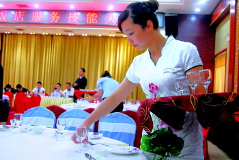 赛后,市旅游局从这次比赛的优秀选手中,抽选队员组成两支队伍,参加省旅游饭店行业服务技能大赛组委会于7月下旬举行的全省决赛。图为比赛现场。 本报记者 张建丽 摄影报道