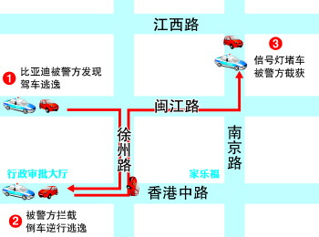 没想到,看到前方有警车,“代步车”并没有停下,顾不上调转车头,“代步车”索性倒车逆行了两三百米,再次拐进了徐州路。赵鹏见状只好鸣响警笛,继续紧追。这时,“代步车”一路沿徐州路自南向北逃窜,后右转驶上闽江路。眼看后面警车越追越近,前方的闽江路南京路路口又亮起了红灯,“代步车”依然不顾交通法规,猛打方向盘驶入右转车道,并强行借道左转驶入南京路。无奈当时南京路南向北车流量较大,南京路江西路路口又恰好是红灯,前路被堵,后有警车,“代步车”终于被逼停。