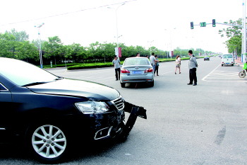 “北京路与聊城路交汇处发生一起车祸,一辆黑色轿车和银色夏利轿车相撞。”18日16时45分许,本报接到热心读者李先生打来的热线电话。5分钟后,记者赶到车祸现场看到,黑色轿车车头保险杠已断裂,大灯和雾灯均已损坏,夏利车左前侧车门出现大面积凹陷。