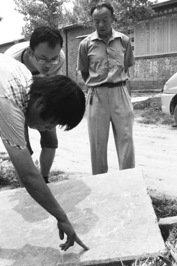 东魏村支部书记梁希庆辨认残存石碑上面的字迹。