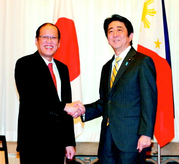 安倍在会谈开始前的致辞中说,在过去12个月里,他和阿基诺三世先后四次会面,两人之间的联系“非常频繁”。安倍称菲律宾是日本“战略伙伴”,两国拥有“共同的价值观”。