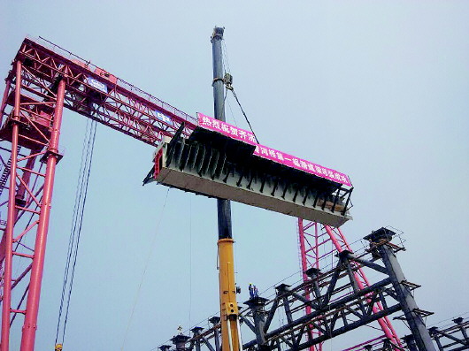 10日上午,第一榀滑道梁成功完成吊装,为后续滑道梁的安装提供了定位基准。