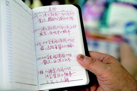 ◥发表的文章都清清楚楚记录在笔记本上。 本报记者 韩逸 摄