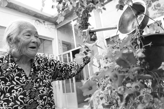 ▲陈香田老人在小院里养了不少花,花开的时候她心情更好。