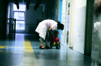 在陌生的环境里,男孩不时哭泣着。  本报记者 马志勇 摄