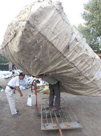 时间:2014年8月1日 自述:大袋废品由于体积大,无法称重,男子用力背起来,站到秤上称重。 点评:紧急的时候,总能猛然想出办法。