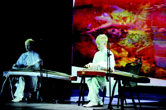助残文艺晚会现场,一对双胞胎盲童在舞台上为观众表演了一曲《战台风》,动作娴熟,协调一致,一曲终了引来现场观众热烈的掌声,不少观众离开座位上前拍照。