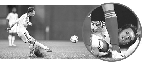 贝尔起脚时,可以看到溅起一大片黑色橡胶粒,威尔士大将拉姆塞在这场比赛中脚踝受伤。