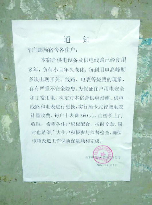 记者来到杨先生家所在的南辛庄西路8号院邮政局宿舍,看到了盖有山东邮政公司济南市分公司公章的通知。通知中写道,“本宿舍供电设备及供电线路已经使用多年,负荷小且年久老化,每到用电高峰期多次出现开关、线路、电表等烧毁的现象,存有严重不安全隐患。为保证住户用电安全和正常用电,决定对本宿舍供电设施、供电线路和电表进行更换,实行插卡式智能电表计量收费。每户卡表费360元。”