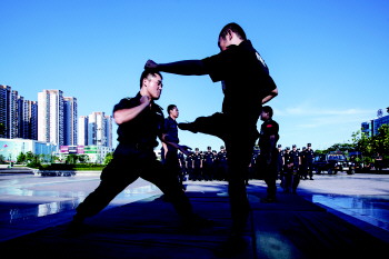 在当天的启动仪式上,邹城特警进行模拟演练。在演练中,巡控队员们精神抖擞,不仅表演了队列、擒敌拳、摔擒、棍术等科目,还结合日常实际,针对在巡逻执勤中发现可疑人员携带管制刀具、执勤队员遭遇一名或多名歹徒袭击、多名暴徒袭击无辜群众等4种突发状况进行实战演练。