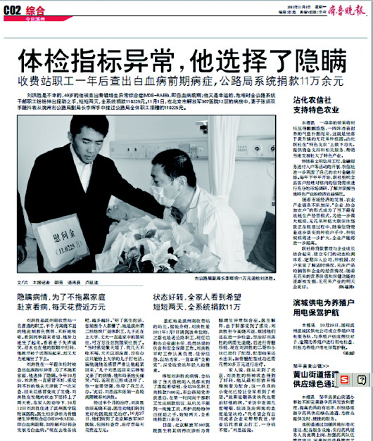 关于刘洪胜本报曾以《体检指标异常,他选择了隐瞒》《身患重症,他选择捐献眼角膜》《轻轻的他走了,光明留在人间》为题进行连续报道。刘洪胜是205高速公路滨州管理处滨州南收费站的一名普通职工,2013年被确诊为骨髓增生异常综合征,由于病情恶化,转化为白血病。离世前的刘洪胜曾说,本来他想把他的全部器官捐出去,捐给学校,捐给医院,让人们作为医疗研究用。后来知道自己得的是血液病,其他器官都不能用,只有眼角膜可以捐献。就在今年4月22日,身患白血病的他在捐献眼角膜的志愿书上郑重地签上了自己的名字,于23日20时左右逝世。