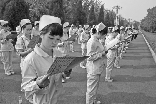 ◤27日,来自曲阜卫生系统的护士们正在参加经典诵读排练。