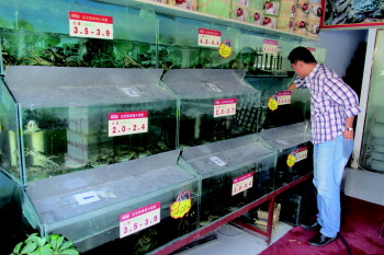 “今年的开湖时间在中秋节之后,所以销量与往年相比就下降了两三成。现在的客流量也比较少,每只大闸蟹比往年便宜10%至20%。”丁明亮说。
