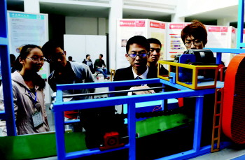 中国石油大学(华东)的闫书法、张良和白永涛设计的一个海油勘探潜水器,吸引了众多专家的目光。这个作品以“蛟龙号“为基础,对原有潜水器进行改进,使其作业更加灵活。“目前,我们对多个方面进行创新和改进。大体包括增加可伸缩陆上行走机构,解决陆上运行需要吊车运载的问题;增加破岩机械手,对海底大块有价值的资源进行摘取,便于携带。”闫书法说。