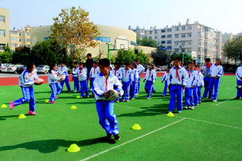 24日,在台东六路小学,五年级的学生在体育课上学习橄榄球。本学期,该校实现每个年级一个特色体育项目,使学生小学期间至少掌握六种体育技能,分别为:一年级跆拳道,二年级空竹,三年级乒乓球,四年级击剑、五年级橄榄球、六年级篮球,所有课程全面免费。