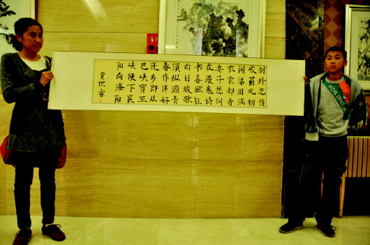 贾世睿和妈妈一起向记者展示了自己的一幅《闻官军收河南河北》的作品。一位同样来参加书画展的书法爱好者尚未离开,看过小世睿的作品后对这么小的年纪有这样的作品给予肯定,也指出世睿在起笔落笔等方面存在的一些不足,他告诉世睿,学习书法要下苦功夫,需要保持不急不躁的心态,平日也要多加练习,长此以往一定会取得好进步。