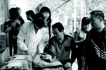 工作人员为市民免费测量血压。