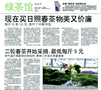自走进齐鲁晚报大家庭,“日照绿茶”就陪伴我左右。一年多来,我从茶叶门外汉逐渐成长,我与伙伴们深入茶园、跑茶市、逛茶店、结交茶企前辈,所走出的每一步都在“绿茶馆”专栏里留下了深刻的印记。与其说我们给大家呈现了日照绿茶的产业一角,不如承认我们也带着一份虔诚和惶恐走进了绿色的产业王国,浸心其中并将原以为是程序化的工作逐渐转变为对这片树叶的热爱。